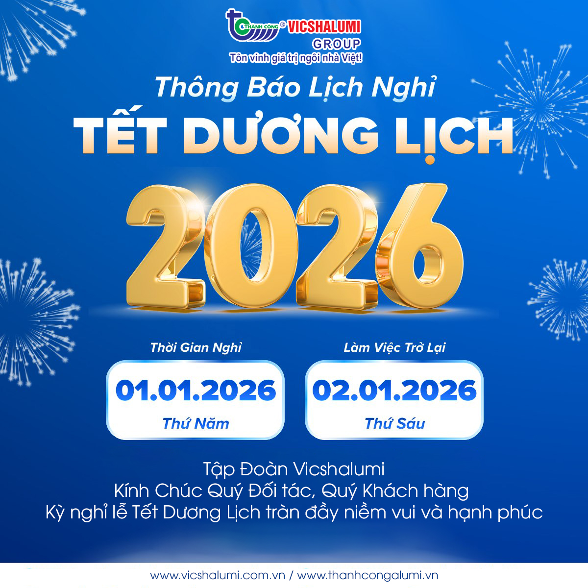 Chào đón năm mới 2026, Tập Đoàn Vicshalumixin trân trọng thông báo tới Quý Khách hàng và Đối tác lịch nghỉ Tết Dương lịch. Để thuận tiện cho việc sắp xếp kế hoạch kinh doanh và nhập/xuất hàng hóa, kính mong Quý khách lưu ý thời gian hoạt động của chúng tôi như sau: