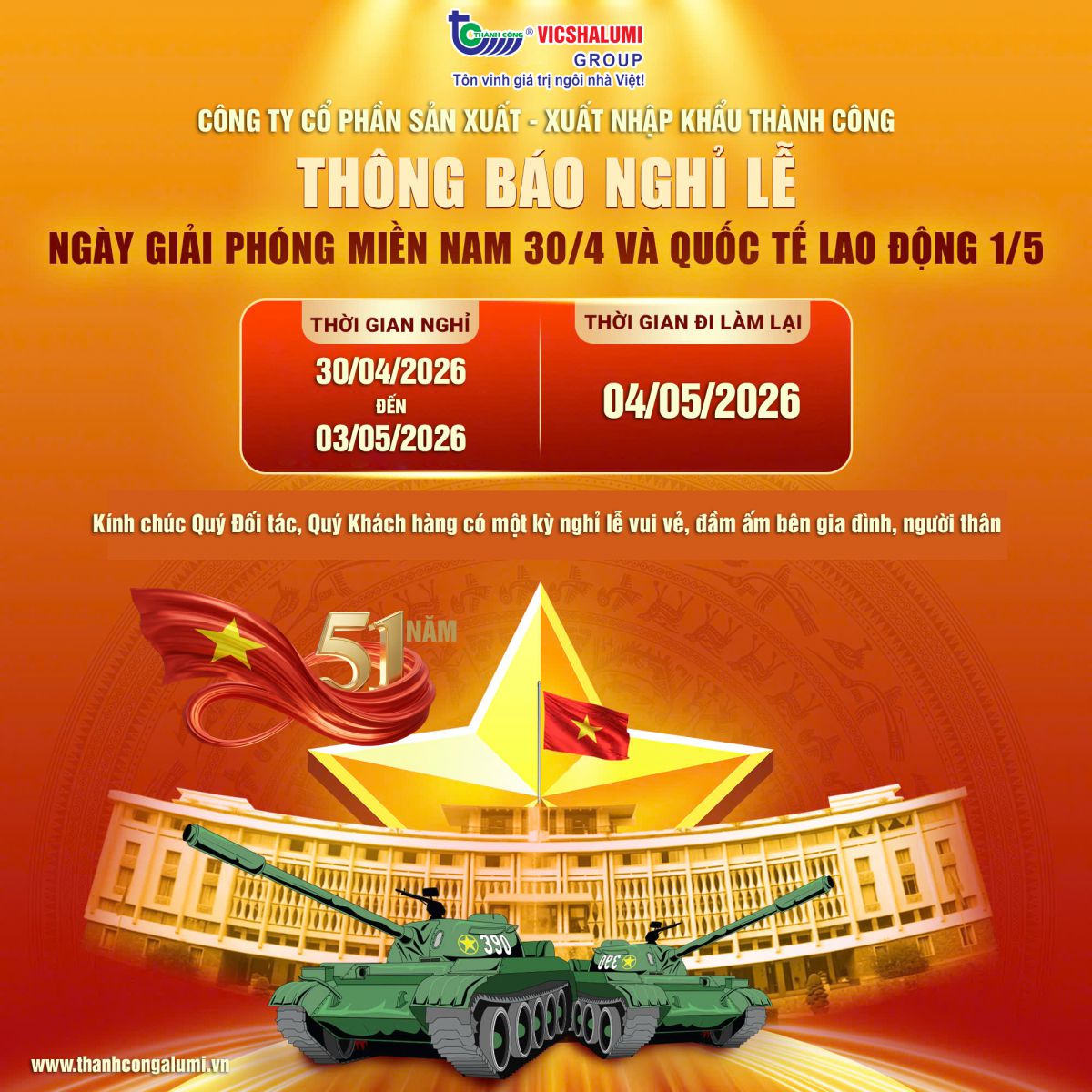 Tập Đoàn Vicshalumi Thông Báo Lịch Nghỉ 30/04 và 01/05